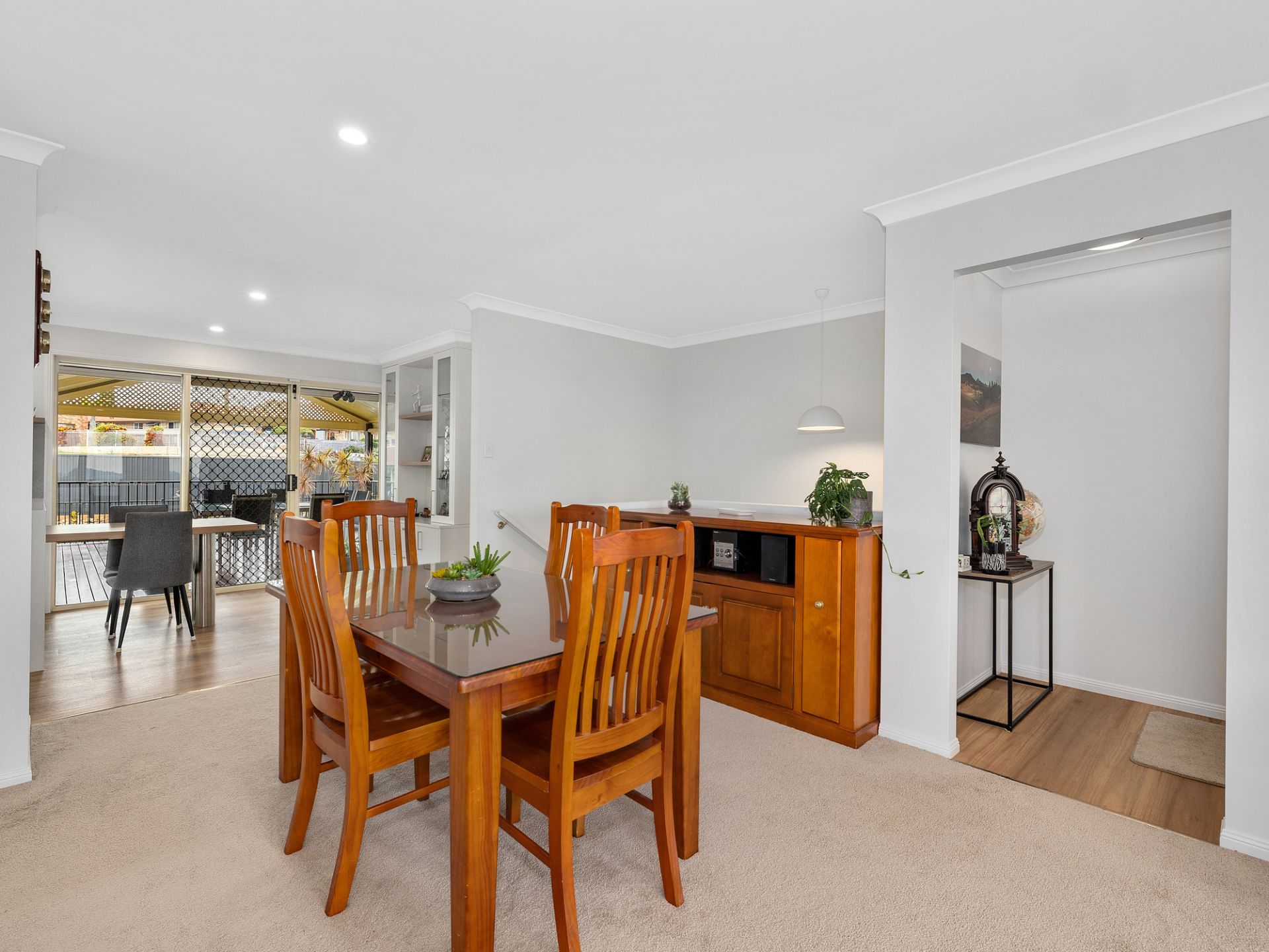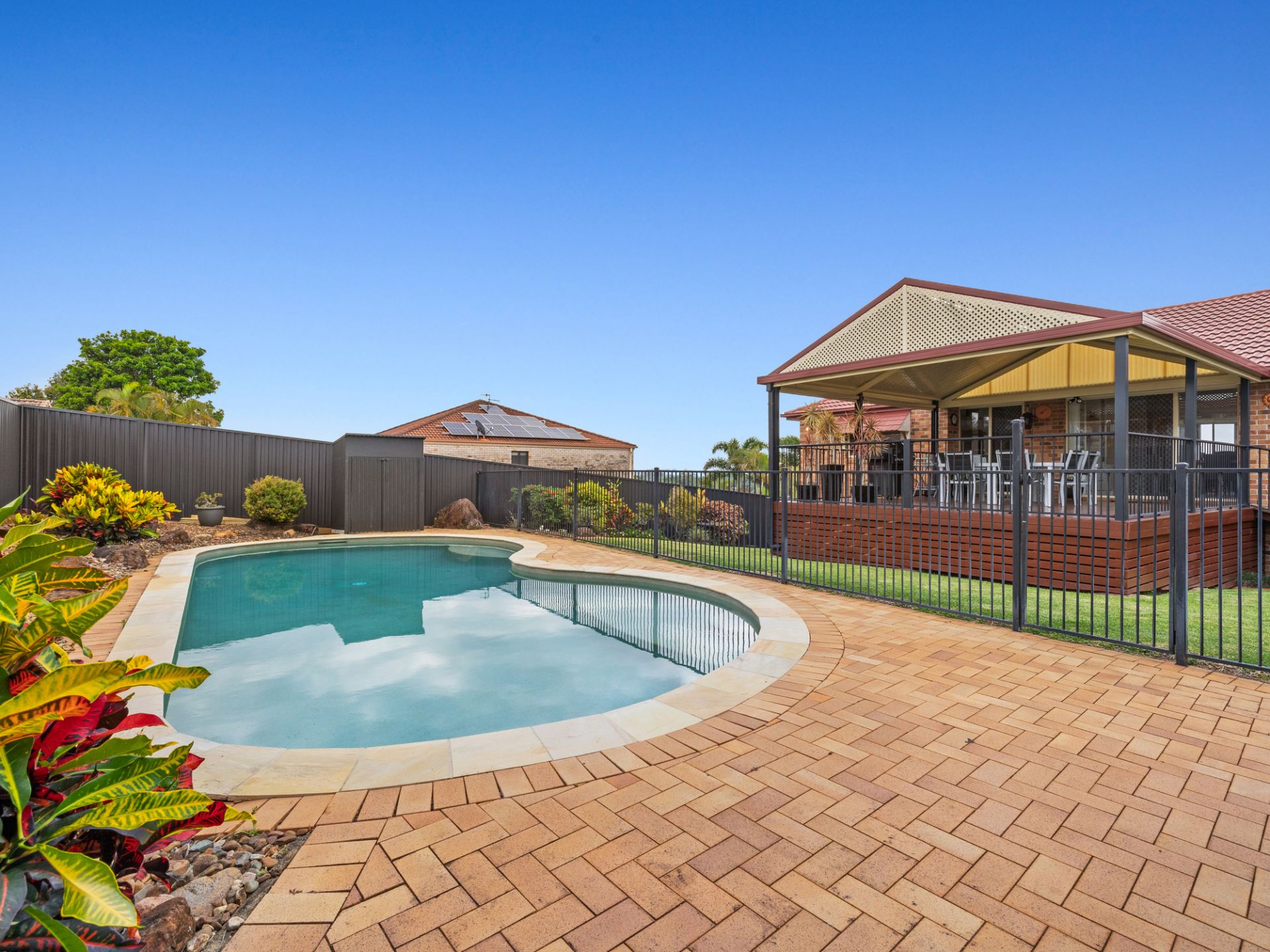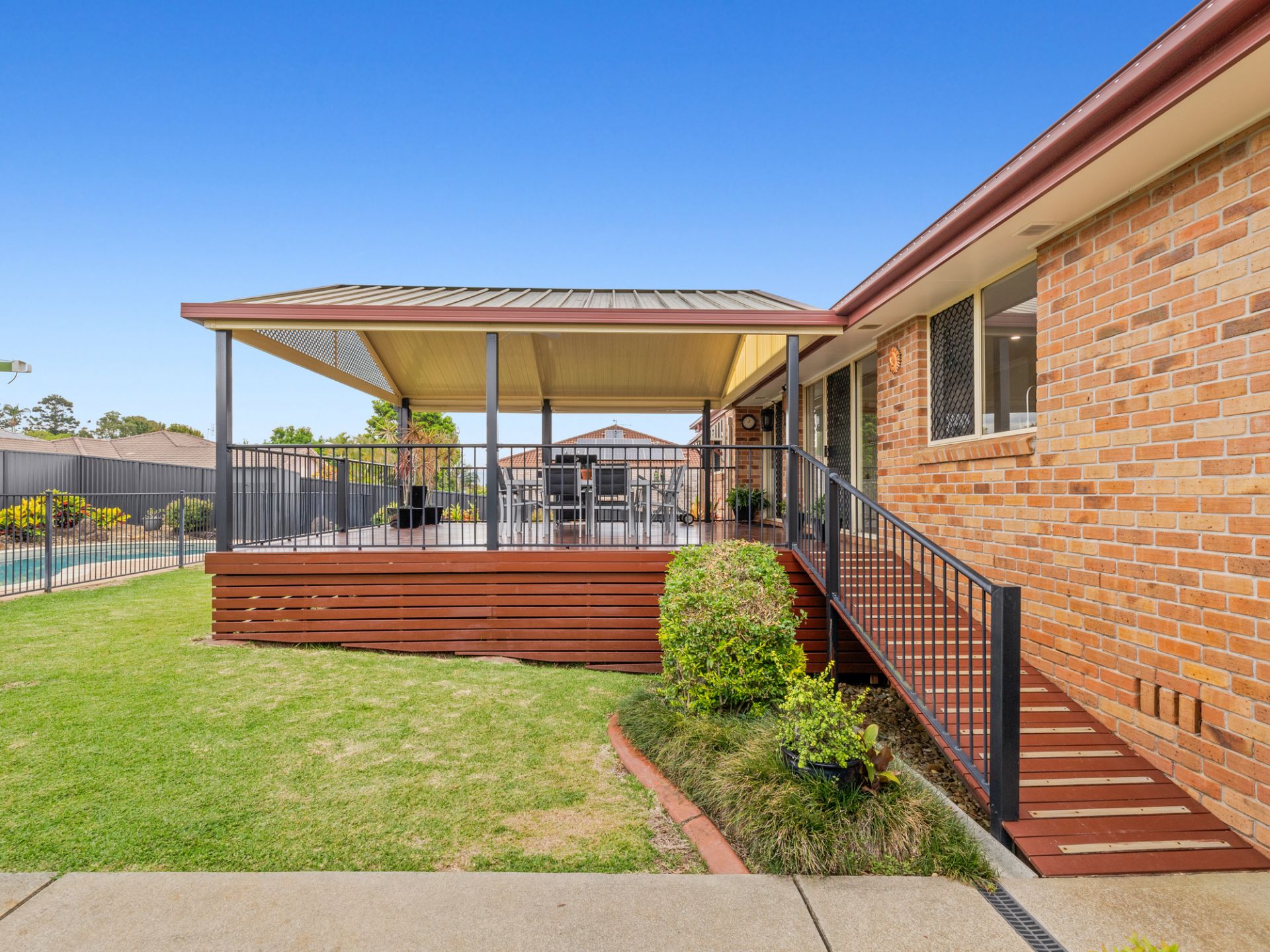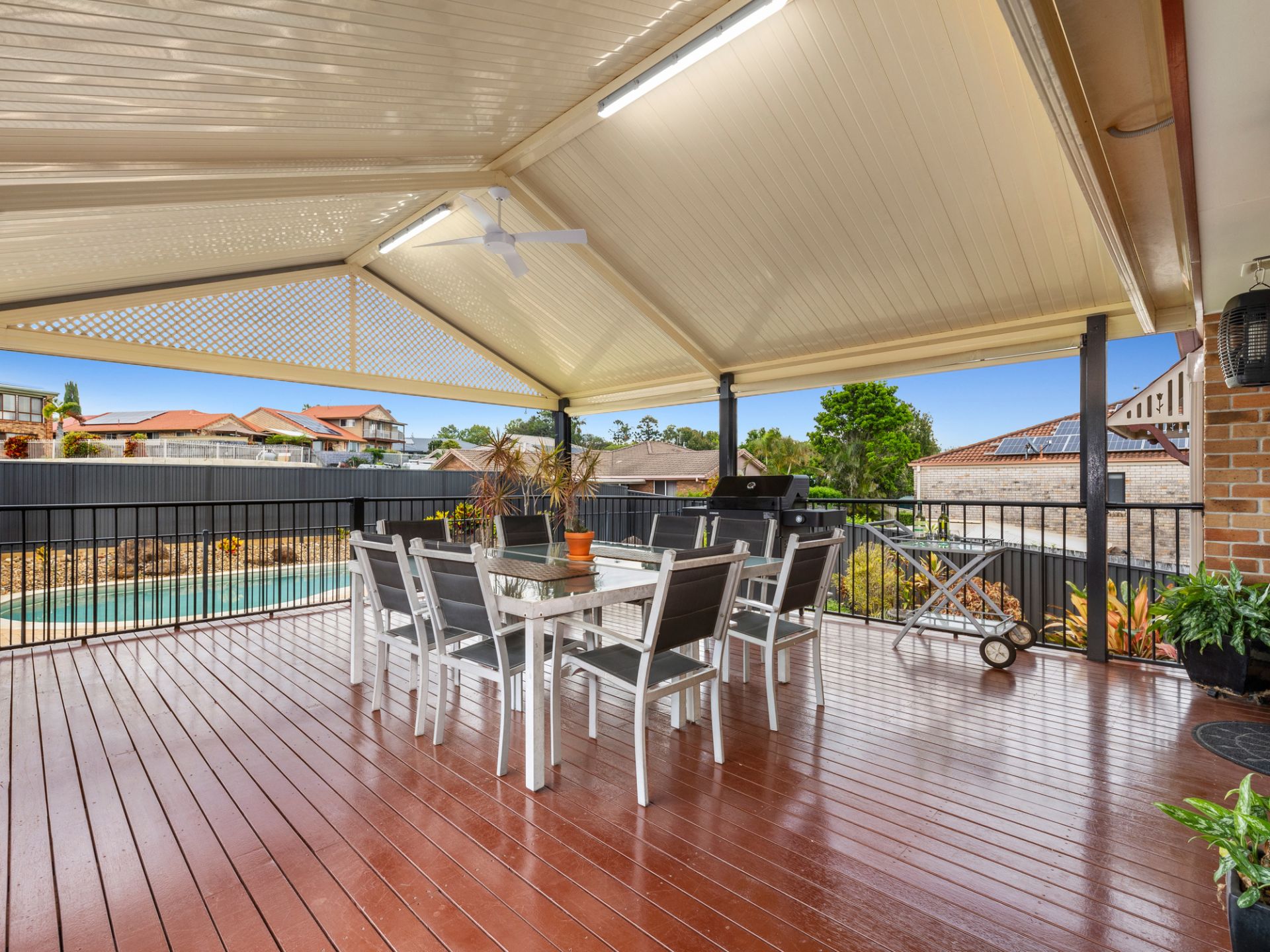 Sip champagne with your guests on the rear large private covered pergola overlooking the sparkling inground Saltwater Pool.