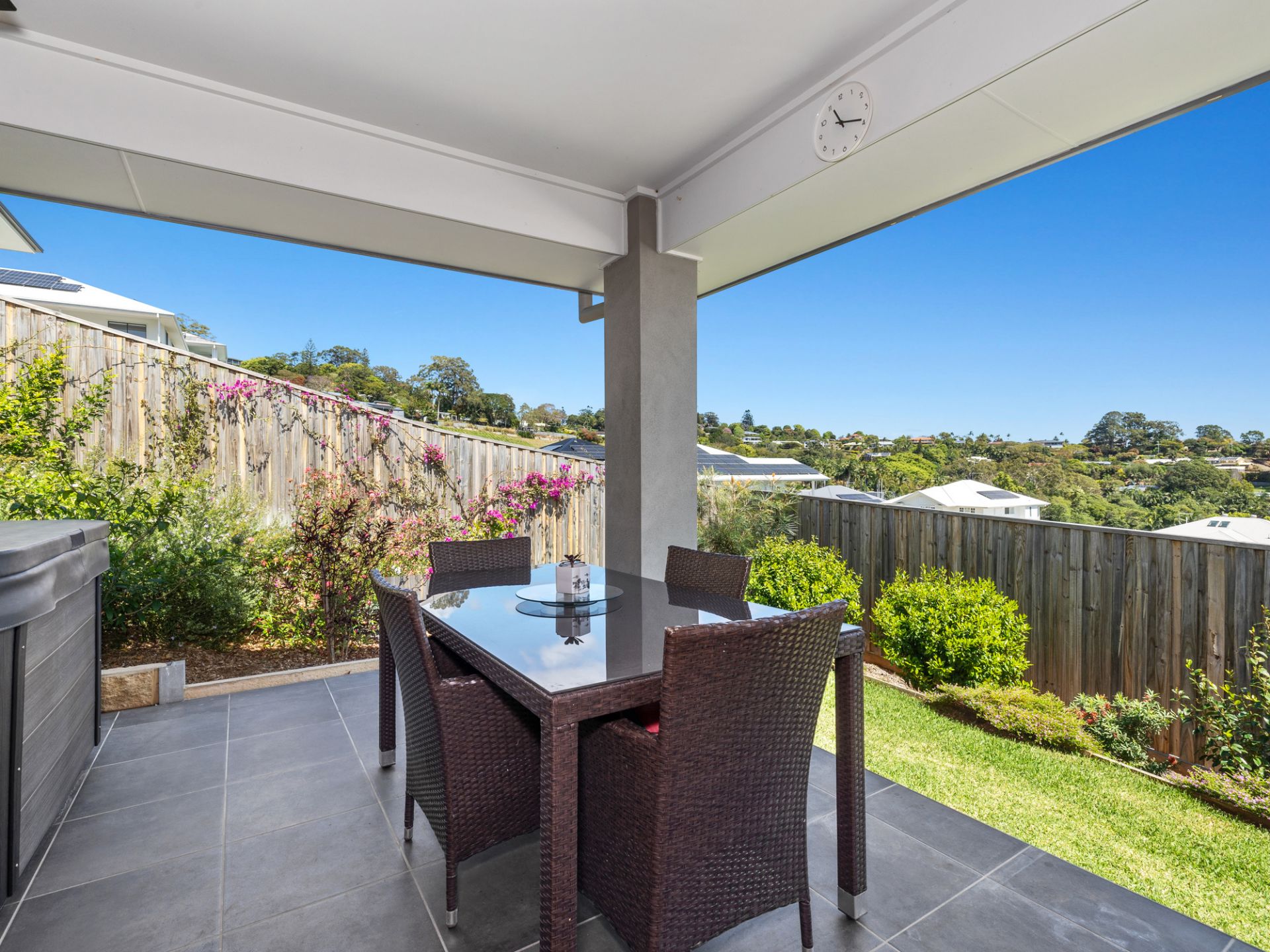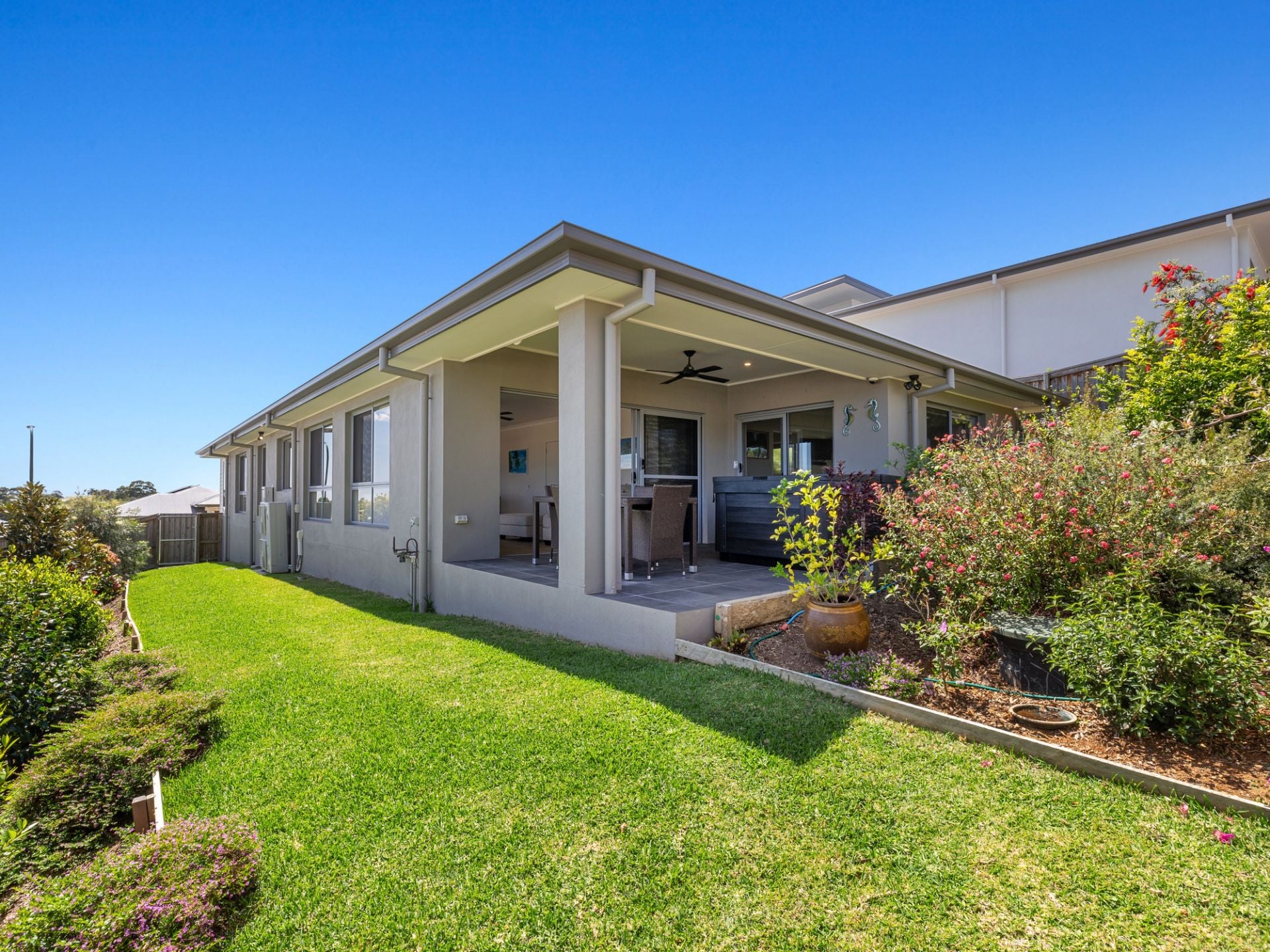 The open plan living with high ceilings throughout and Hibrid Timber flooring thru the whole home, opens onto the under roof private alfresco area at the rear thru wide glass sliding doors and overlooks the manicured gardens behind the concrete sleeper retaining walls.