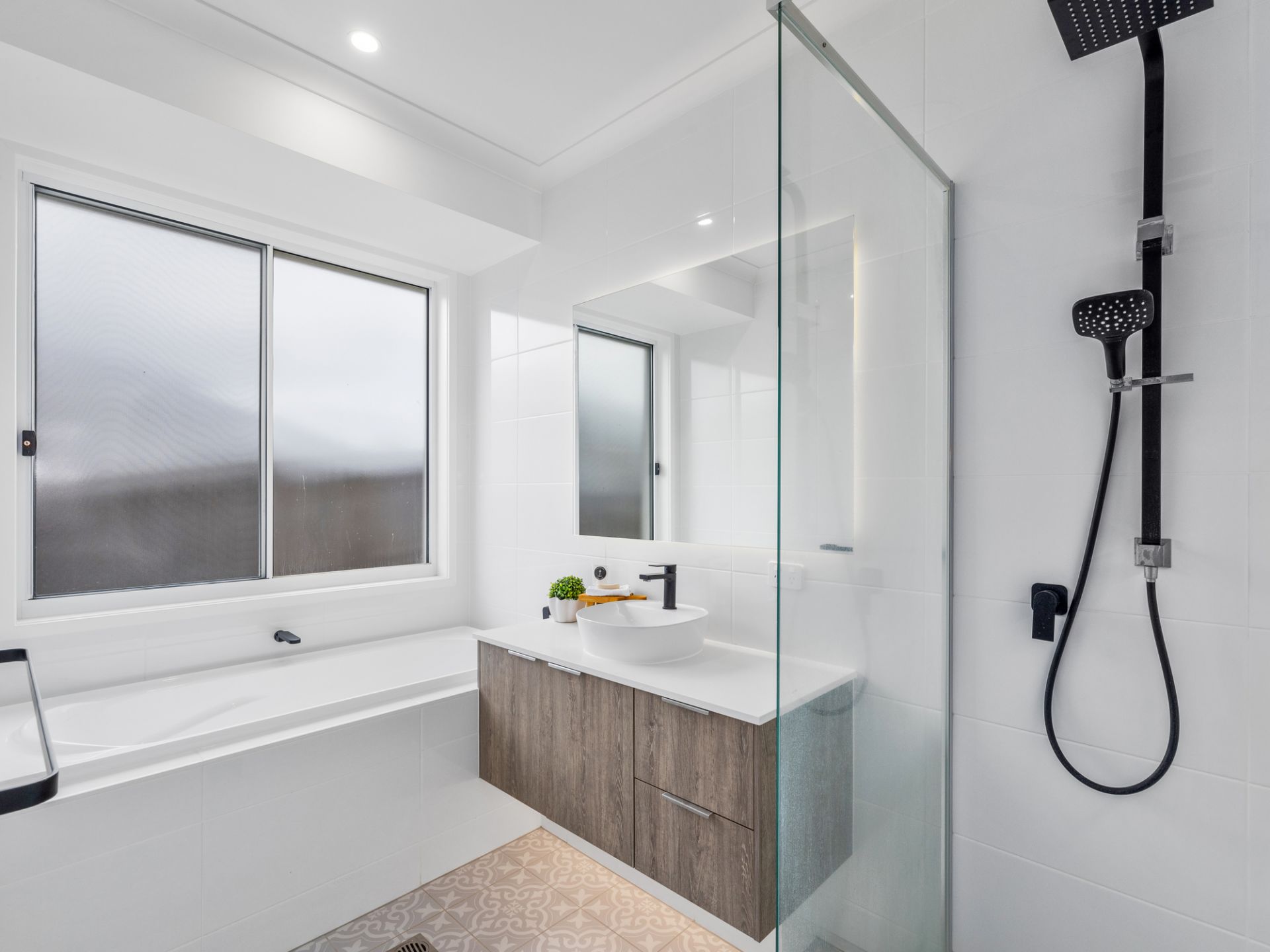 • Floor-to-ceiling tiles in bathrooms.
