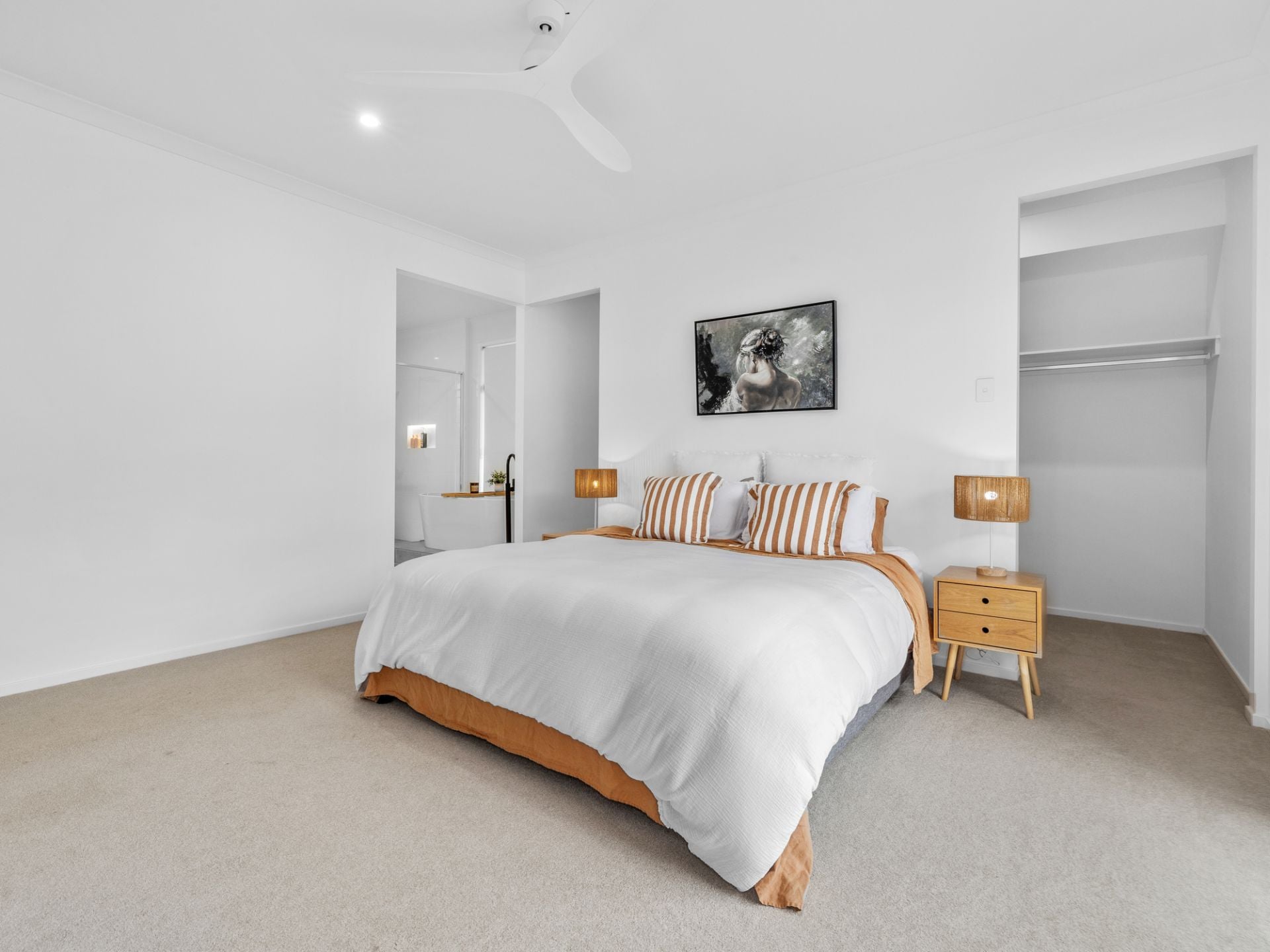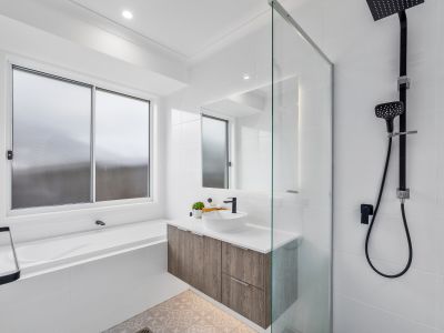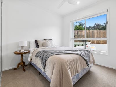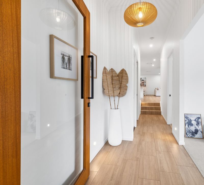 In the private rear of the home, the master suite features a walk-in robe and an ensuite with a walk-in shower and a freestanding bath. Two additional bedrooms with built-in wardrobes share a stylish family bathroom with another built-in bath and walk-in shower. A full-sized laundry, double remote-operated garage, extra parking for a boat or caravan, and a two-car carport complete this thoughtfully designed home.
