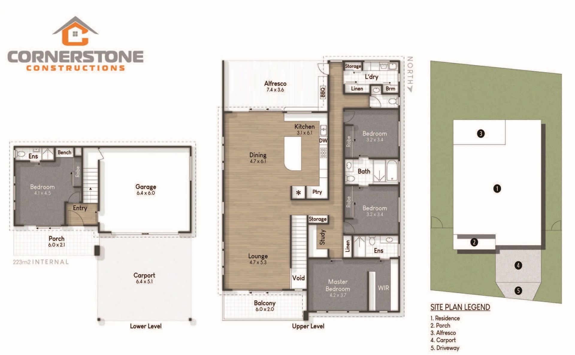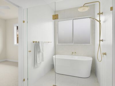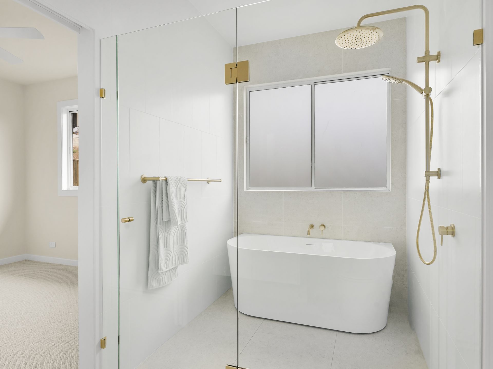 Three bedrooms are located on the main level, including a master suite with a walk-in robe and ensuite. The additional two bedrooms are well-sized and share a stylish two-way bathroom with a freestanding bathtub. A large laundry and study nook add to the everyday functionality of the floorplan.