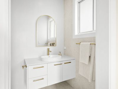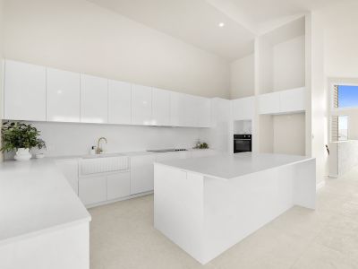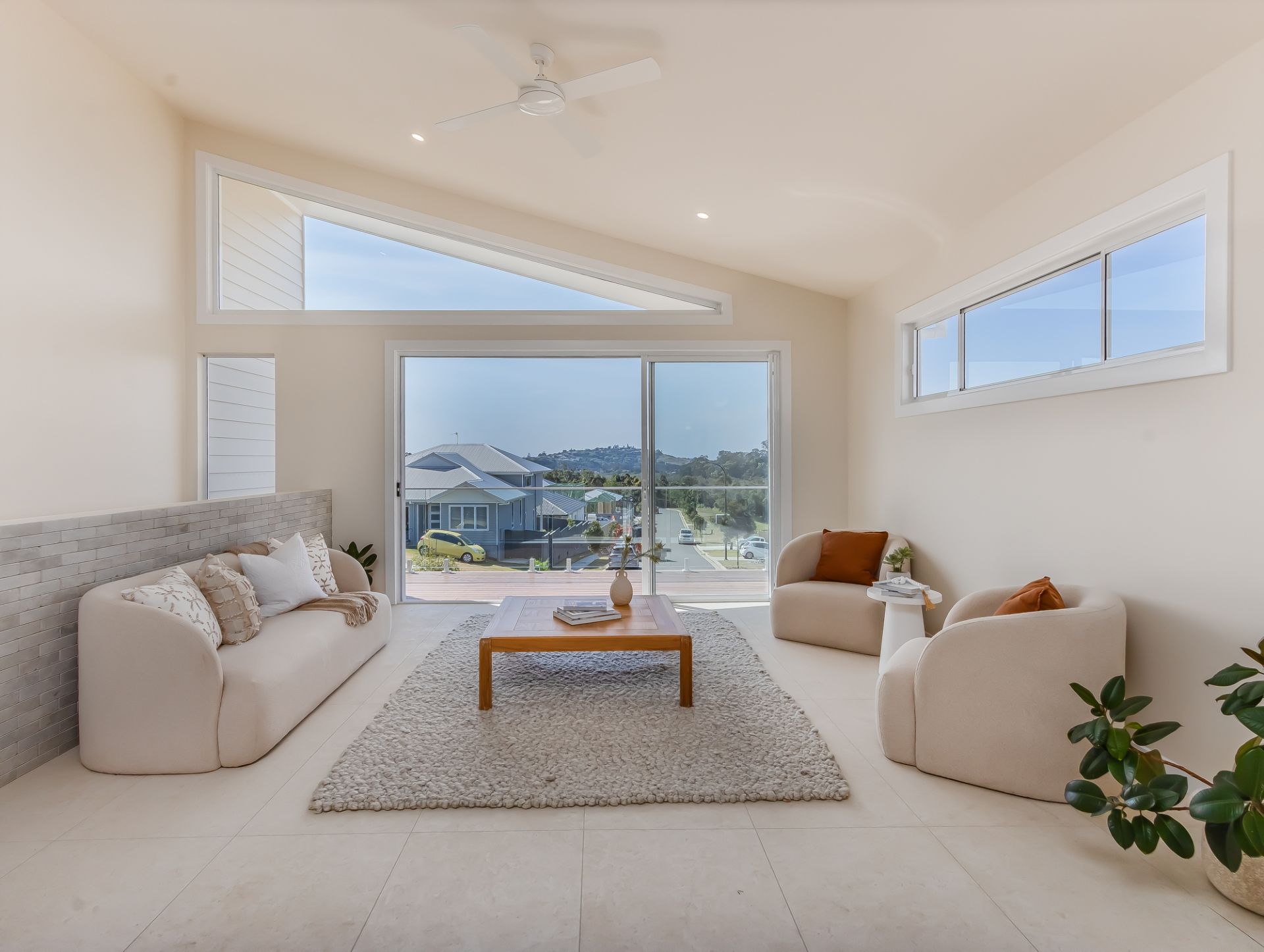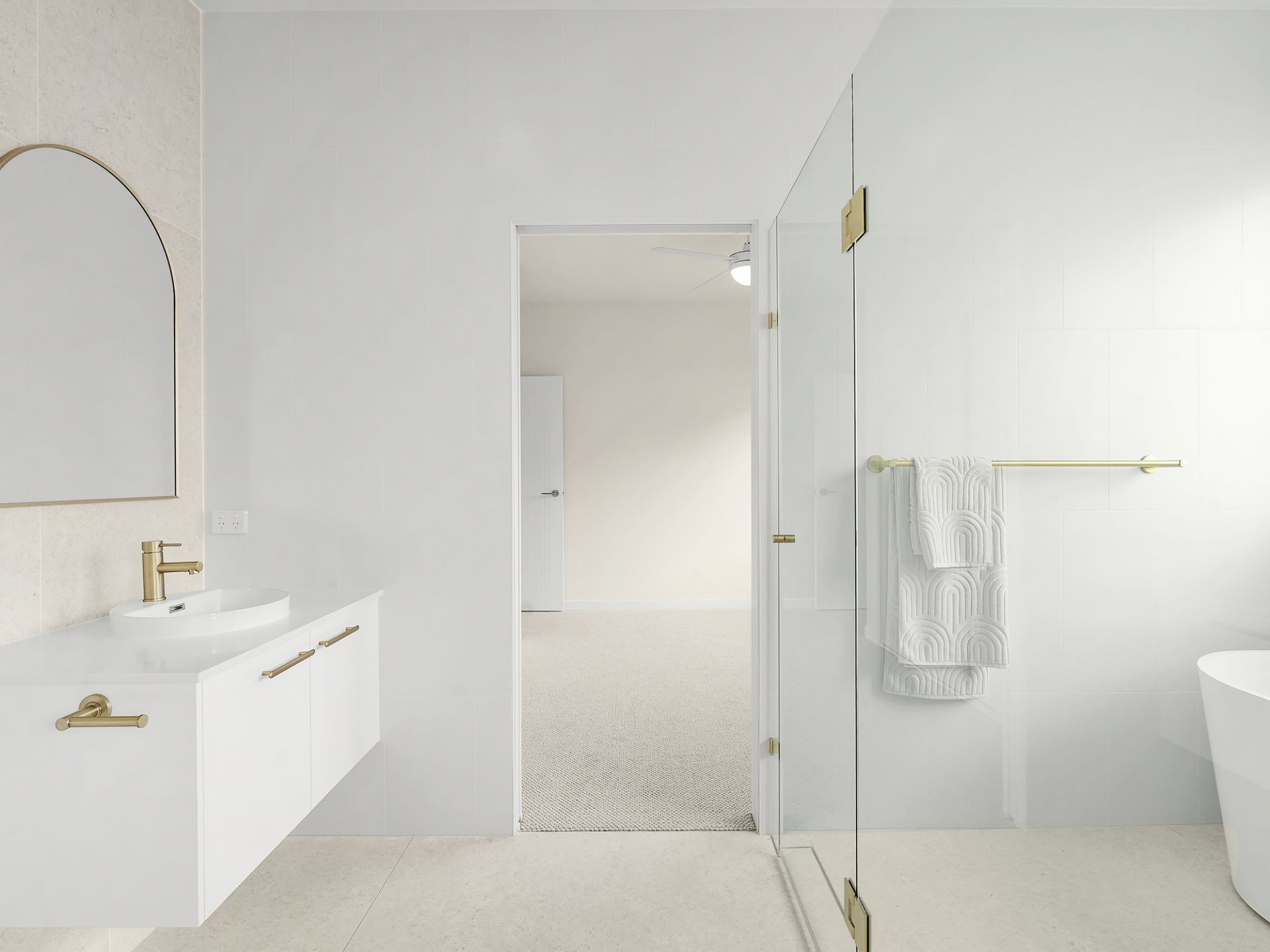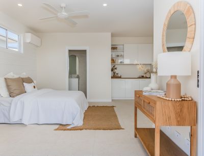 As you step inside, you're greeted by soaring 4.5m raked ceilings over the open-plan living, dining, and kitchen area. Filled with natural light and cooling breezes, this is the heart of the home, finished in soft, natural tones that create an immediate sense of calm. Throughout the home, you'll appreciate the high-end finishes, with brushed brass tapware for added elegance, wool carpet in the bedrooms for comfort and warmth, and practical tiled flooring in the main living and common areas for everyday ease.